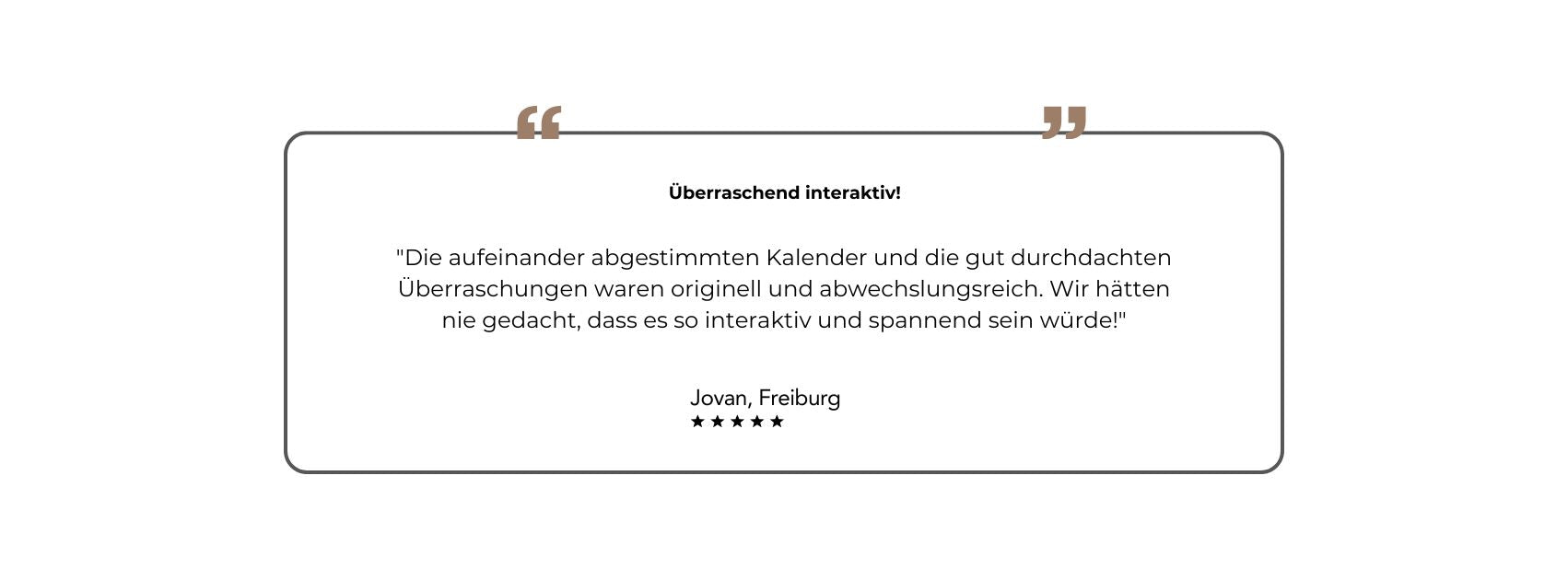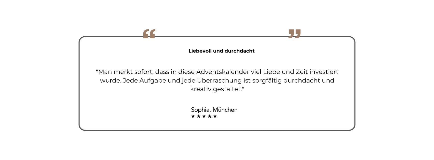 Der Paar-Adventskalender ist so konzipiert, dass die wichtigsten Dinge bereits organisiert sind. Ein kleiner Aufwand, aber eine grosse Wirkung. Unser Motto: Entspannt durch die Weihnachtszeit – riesige Freude bereiten.