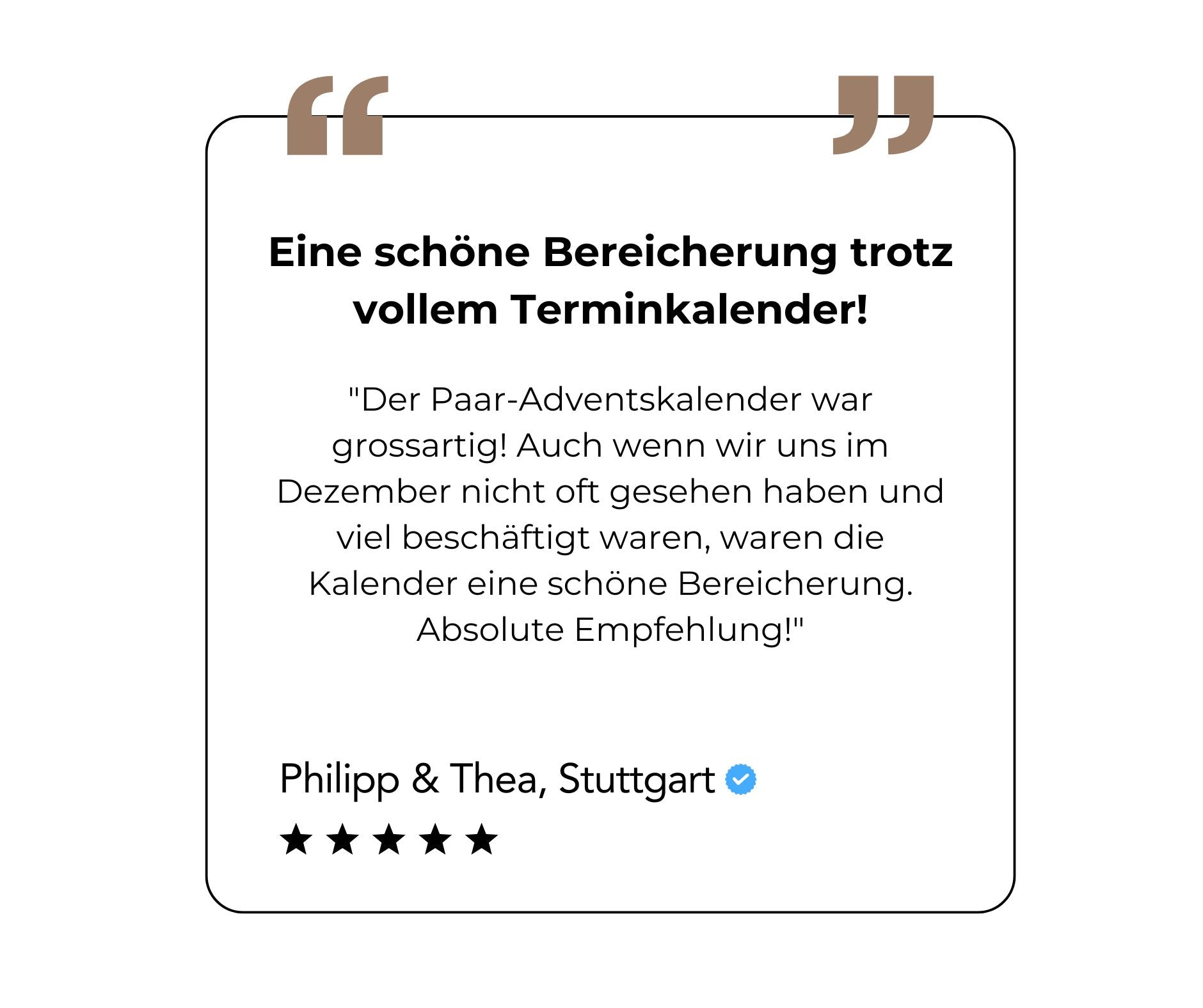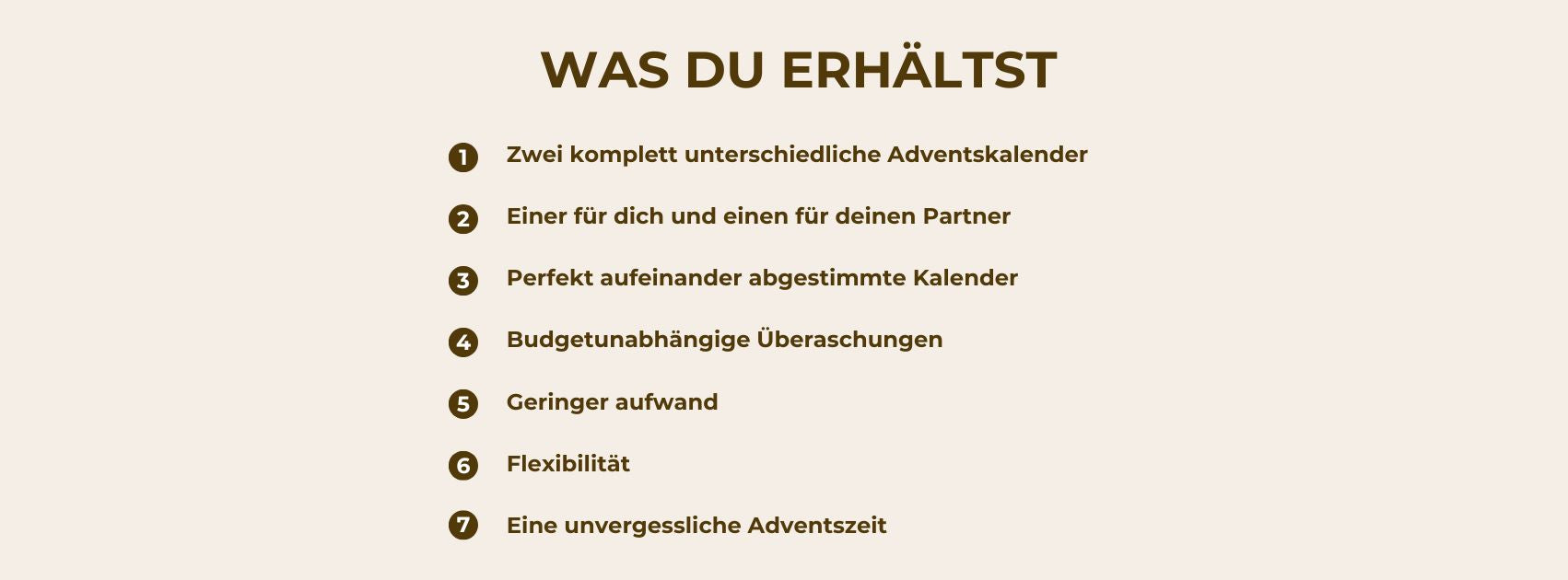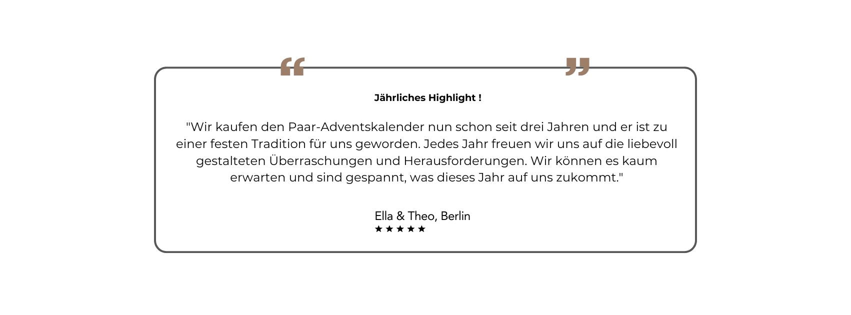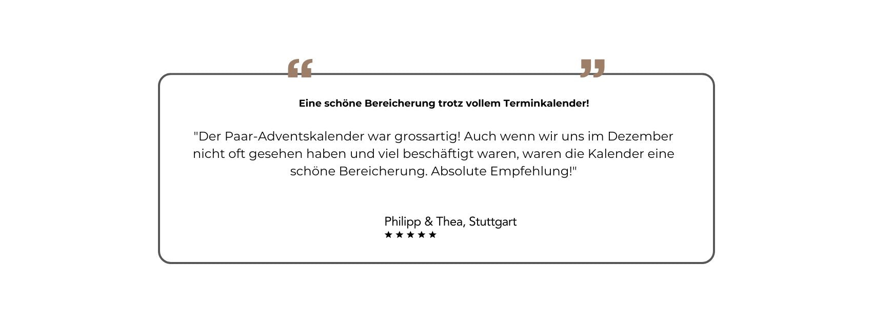Der Paar-Adventskalender ist so konzipiert, dass die wichtigsten Dinge bereits organisiert sind. Ein kleiner Aufwand, aber eine grosse Wirkung. Unser Motto: Entspannt durch die Weihnachtszeit – riesige Freude bereiten.