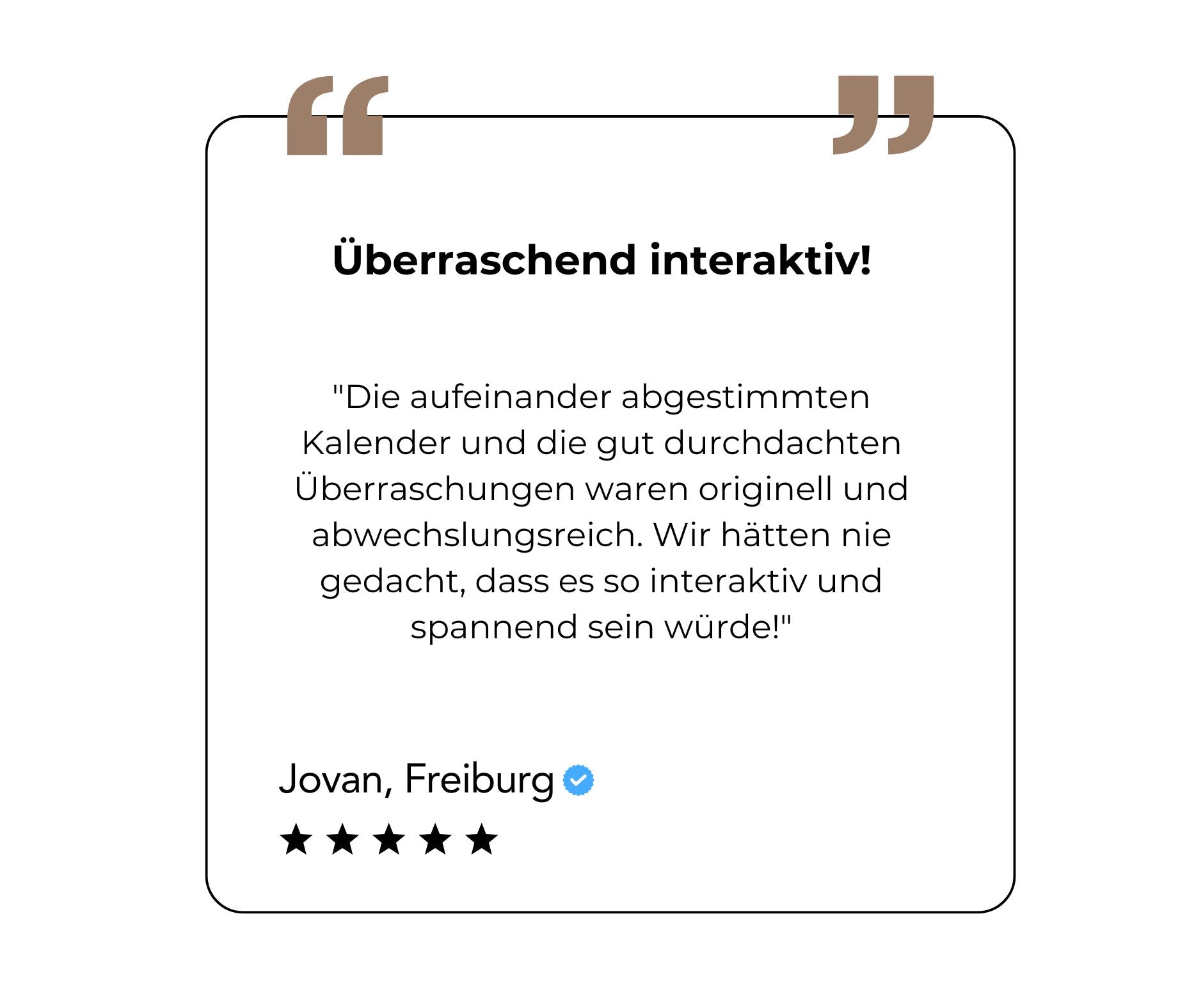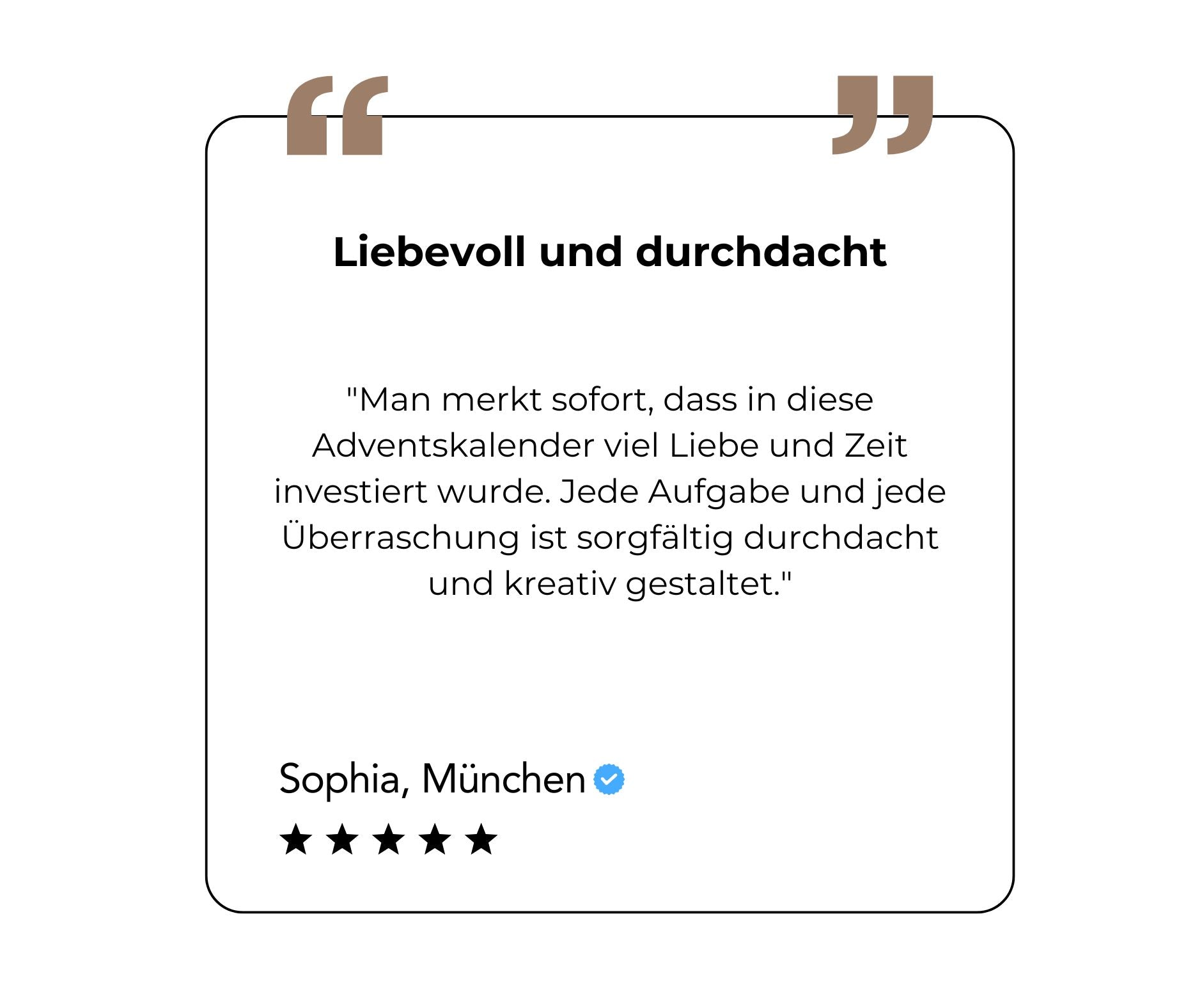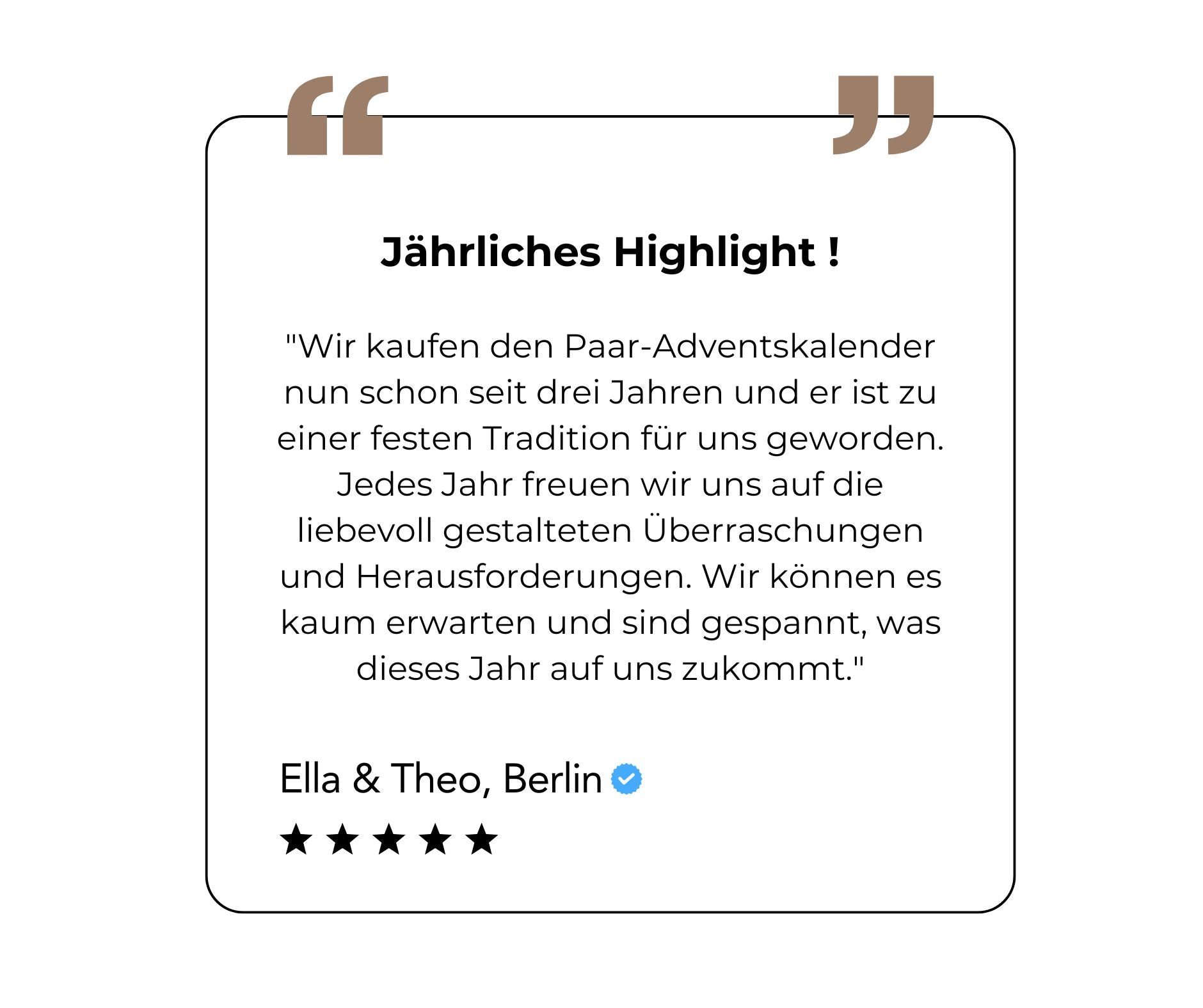Der Paar-Adventskalender ist so konzipiert, dass die wichtigsten Dinge bereits organisiert sind. Ein kleiner Aufwand, aber eine grosse Wirkung. Unser Motto: Entspannt durch die Weihnachtszeit – riesige Freude bereiten.